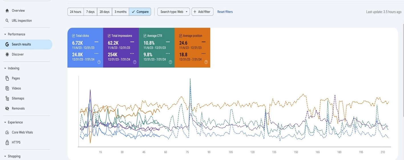 We executed a sustained, multi-month SEO sprint comparing late 2023 baseline metrics to the accelerated growth achieved by mid-2024. By continuously refining site architecture and content, we built a compounding growth engine that scaled traffic month over month.